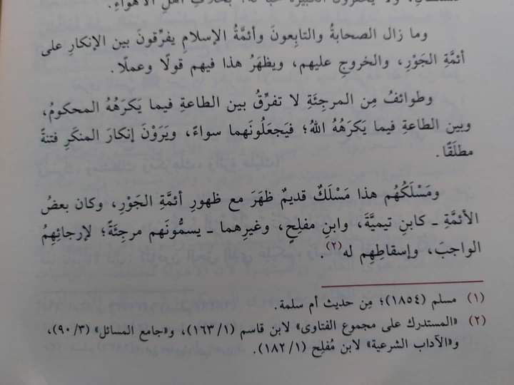 “Para sahabat, tabi’in dan para imam Islam senantiasa membedakan antara mengingkari penguasa durjana dengan melawan mereka serta menampakkan pengingkaran tersebut dengan ucapan dan tindakan mereka atas kejahatan penguasa. Sedangkan beberapa kelompok murjiah tidak membedakan antara taat pada penguasa dalam perkara yang dibenci oleh rakyat dan antara taat pada perkara yang dibenci oleh Allah. Mereka menyamakan hal teesebut sehingga mereka berpendapat mengingkari kemungkaran penguasa adalah fitnah secara mutlak.