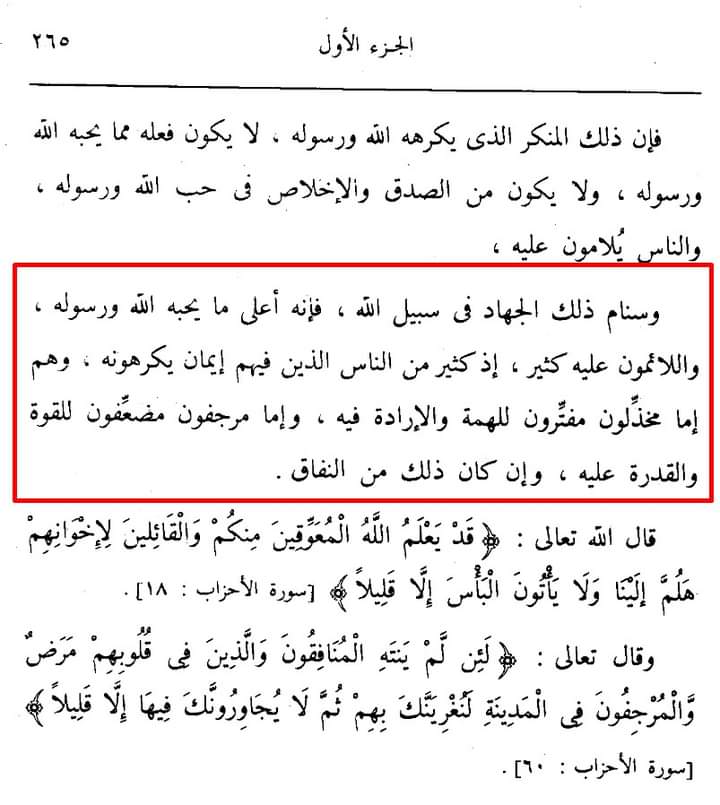 وسنام ذَلِك الْجِهَاد فِي سَبِيل الله فَإِنَّهُ أَعلَى مَا يُحِبهُ الله وَرَسُوله واللائمون عَلَيْهِ كثير إِذْ كثير من النَّاس الَّذين فيهم إِيمَان يكرهونه وهم إِمَّا مخذلون مفترون للهمة والإرادة فِيهِ وَإِمَّا مرجفون مضعفون للقوة وَالْقُدْرَة عَلَيْهِ وَإِن كَانَ ذَلِك من النِّفَاق