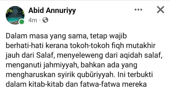 “dalam masa yang sama, tetap wajib berhati-hati kerana tokoh-tokoh fiqh mutakhir jauh dari Salaf,menyeleweng dari aqidah salaf,menganuti jahmiyyah, bahkan ada yang mengharuskan syirik quburiyyah. Ini terbukti dalam kitab-kitab dan fatwa-fatwa mereka”