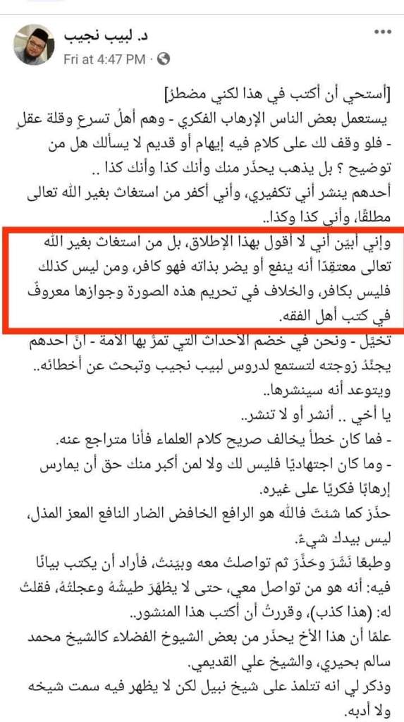 1- Labib Najib. Menurutnya orang yang istighatsah kepada selain Allah dirinci: pelakunya kafir kalau meyakini selain Allah bisa memberi manfaat dan mencelakakan dengan sendirinya (alias meyakini rububiyah selain Allah). Sedangkan yang tidak sampai ke taraf demikian (meyakini hanya sebagai perantara saja sedangkan yang memberi manfaat dan celaka hanya Allah) tidak kafir.