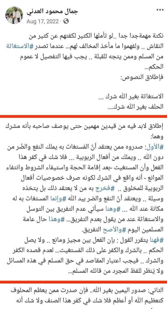 2- Jamal Adeni. Pendapatnya tidak jauh berbeda dari Labib bahkan seolah mempertegas. Ia mengatakan: “Orang yang istighatsah kepada selain Allah disebut musyrik apabila terpenuhi 2 ketentuan: