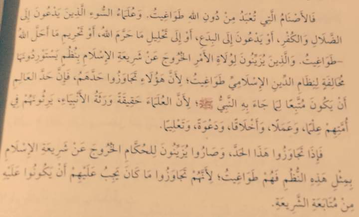 ” Ulama yang rusak yang menyerukan kekafiran dan kesesatan, atau menyerukan kebid’ahan kebid’ahan, atau menyerukan penghalalan apa yang telah Allah haramkan atau sebaliknya pengharaman apa yang telah Allah halalkan, mereka adalah taghut. Demikian juga yang menampakkan indah kepada penguasa agar meninggalkan syari’at Islam beralih dengan undang undang yang mereka datangkan dari luar yang menyelisihi syari’at Islam, mereka adalah taghut. Karena mereka semua telah melangkahi batas kadar mereka, dimana batas kadar seorang ulama adalah menjadi seorang pengikut apa yang dibawa oleh Nabi. Ulama sejati adalah para pewaris Nabi mewarisi ilmu mereka, amal, akhlak, dakwah dan pengajaran ditengah umat mereka. Apabila kemudian melangkahi batasan kadar ini, malahan menampakkan indah bagi penguasa agar meninggalkan syari’at Islam beralih kepada undang undang semisal ini, maka mereka ulama taghut. Karena mereka telah melangkahi apa yang menjadi kewajiban mereka yaitu mengikuti syari’at Islam “.