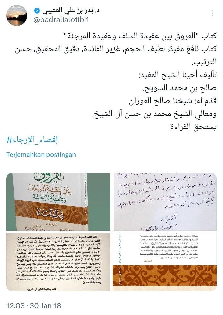 โ kitab Al Furuq baina Aqidatis Salaf wa Aqidatil Murjiah merupakan kitab yang bermanfaat dan berfaidah , halamannya tipis namun faidahnya melimpah , mendalam dalam pengkajiannya , bagus penyusunannya , buah karya saudara kita seorang syaikh yang banyak memberi faidah yaitu Asy Syaikh Sholih bin Muhammad As Suwaiyyih dan kitab tersebut telah direkomendasikan oleh guru kami yaitu Asy Syaikh Sholih Al Fauzan dan Yang mulia Asy Syaikh Muhammad bin Hasan Alu Syaikh , kitab ini sangat layak untuk dibaca โ