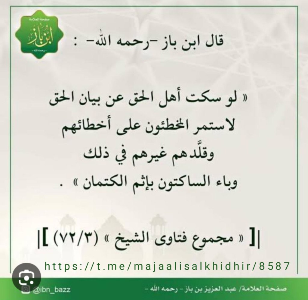 Berkata Ibnu Bazz semoga Allah merahmatinya: “Kalaulah orang-orang benar itu diam dari menerangkan yang benar maka tentu orang-orang yang salah akan terus menerus di atas kesalahan mereka, orang-orang selain mereka akan ikut-ikutan pada kesalahan mereka lalu kembali orang-orang yang diam itu dengan membawa dosa menyembunyikan kebenaran.”