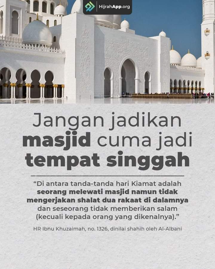 “Di antara tanda-tanda hari Kiamat adalah seorang melewati masjid namun tidak mengerjakan shalat dua rakaat di dalamnya dan seseorang tidak memberikan salam kecuali kepada orang yang dikenalnya).” (HR Ibnu Khuzaimah, no. 1326, dinilai shahih oleh Al-Albani)
