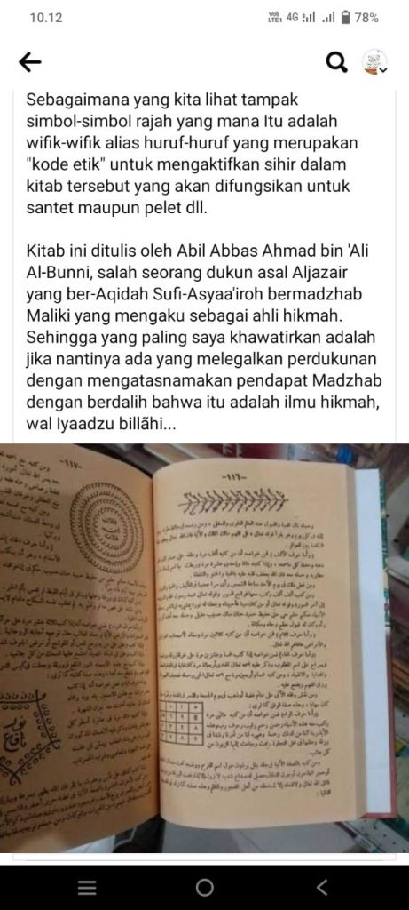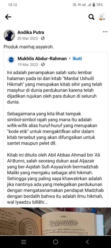 Demi ALLAH Demi ALLAH sekali lagi Demi ALLAH saya pernah ber tanya di postingan facebook nya Andika Putra ini di bagian komentar postingan walaupun sudah terhapus secara makna tentang benar kah bahwa dukun dari Al-Jazair yakni Abil Abbas Ahmad bin Ali Al-Bunni ini adalah kafir musyrik najis thoghut bukan muslim muwahhid walaupun ber aqidah sufi-asyairoh dan ber madzhab Maliki