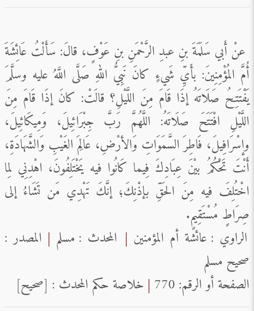 اللهمَّ ربَّ جِبرائيل، ومِيكائيل، وإسرافيل، فاطرَ السماوات والأرض، عالمَ الغيب والشهادة، أنت تحكم بين عبادك فيما كانوا فيه يختلفون، اهدني لما اختُلِف فيه من الحق بإذنك، إنَّك تهدي مَن تشاء إلى صراطٍ مستقيم.