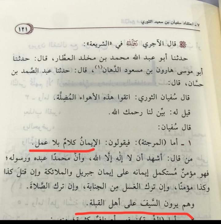 dijawab oleh dua imam ahlus sunnah, imam sufyan bin said ats tsauri dan imam yusuf bin asbat saat menjelaskan ajaran murji’ah diantaranya :